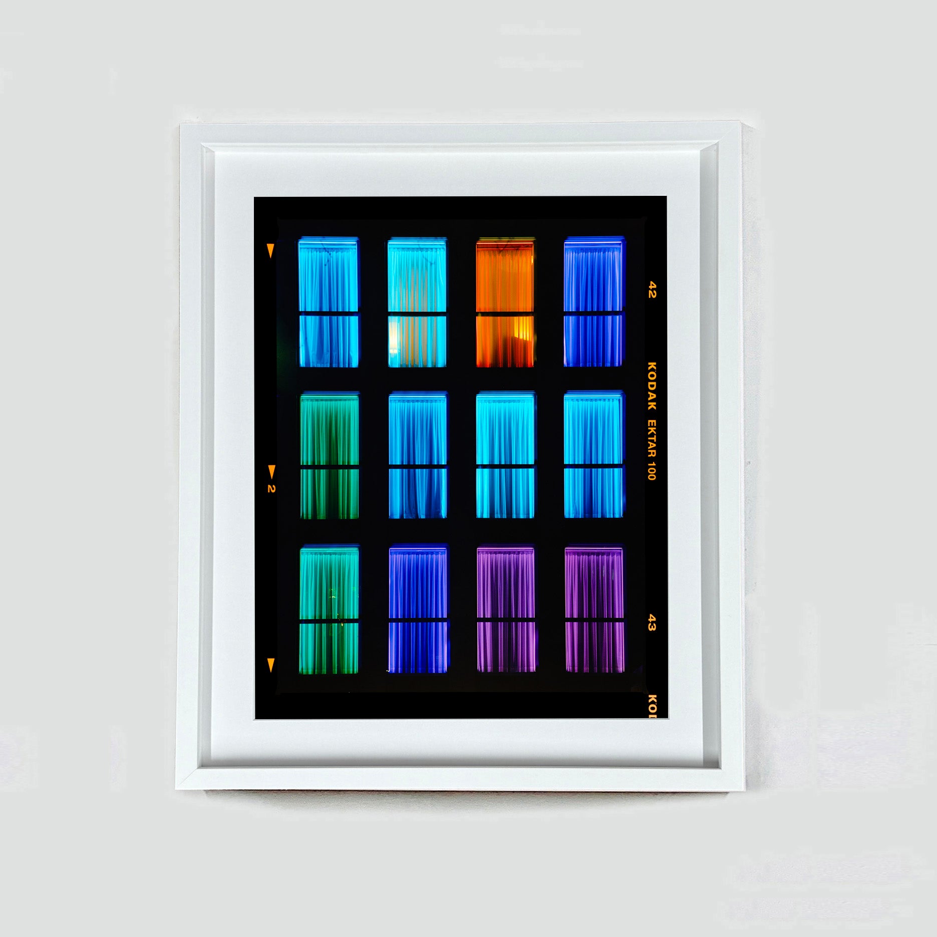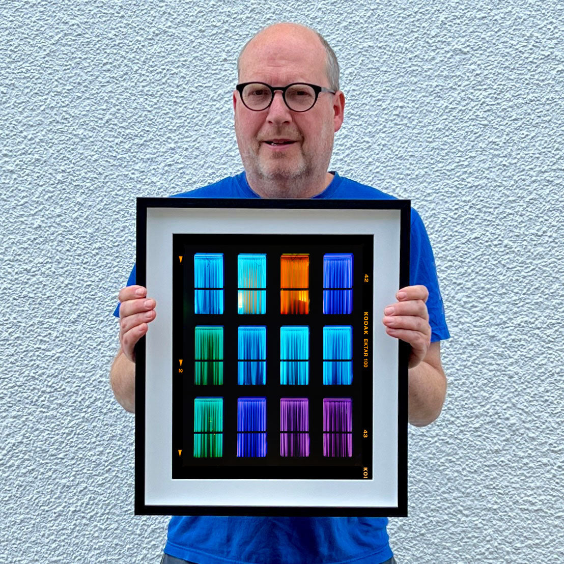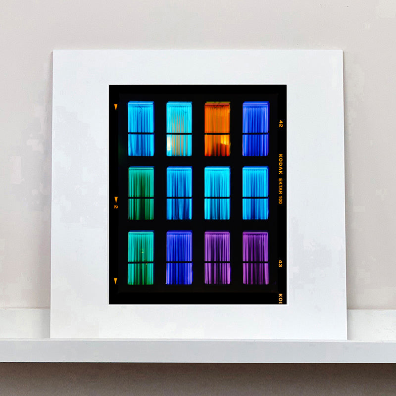 Centric, Italian architecture street photography from Richard Heeps' series, A Short History of Milan. The composition resembles a modern, architectural mosaic, merging minimalism with a raw, emotional spectrum. This artwork stands out for its ability to convey mood and movement through simple yet powerful color contrasts. The uniformity of the window frames juxtaposed with the diverse color palette creates a dynamic visual rhythm, urging viewers to explore each panel individually and as part of the whole.