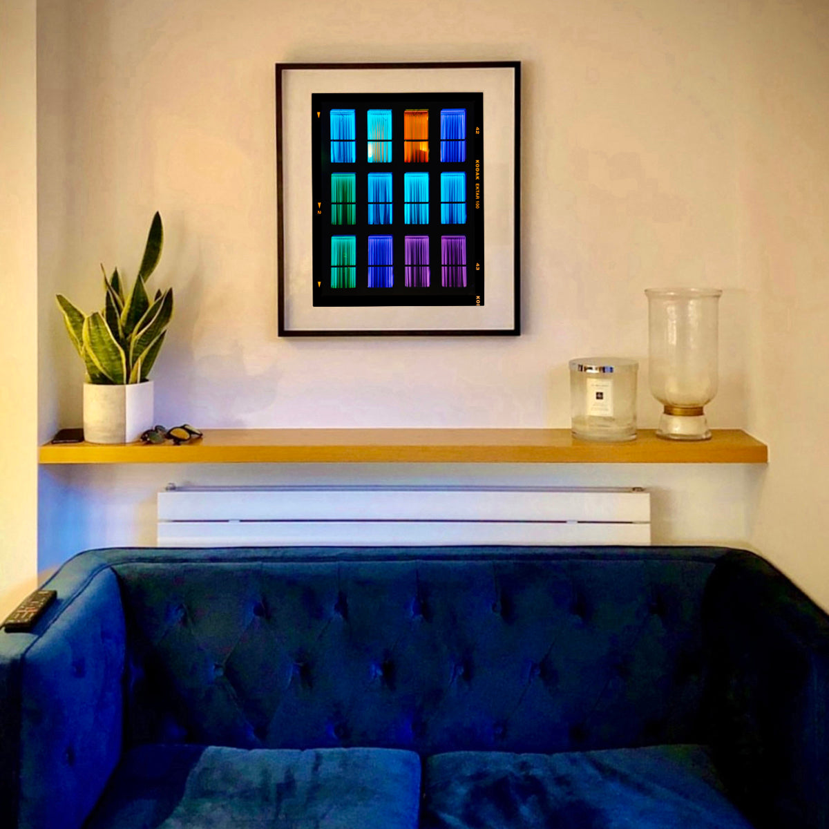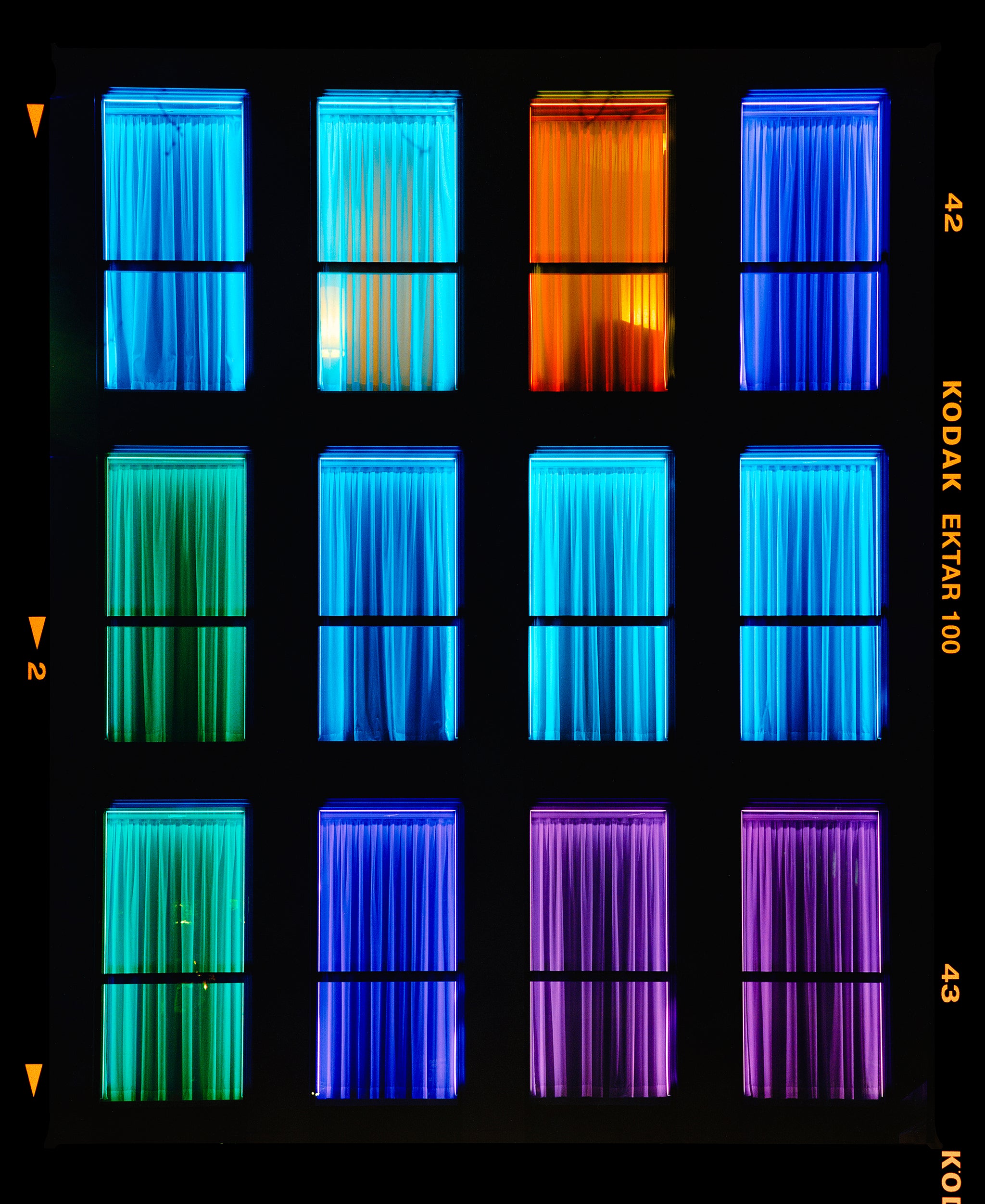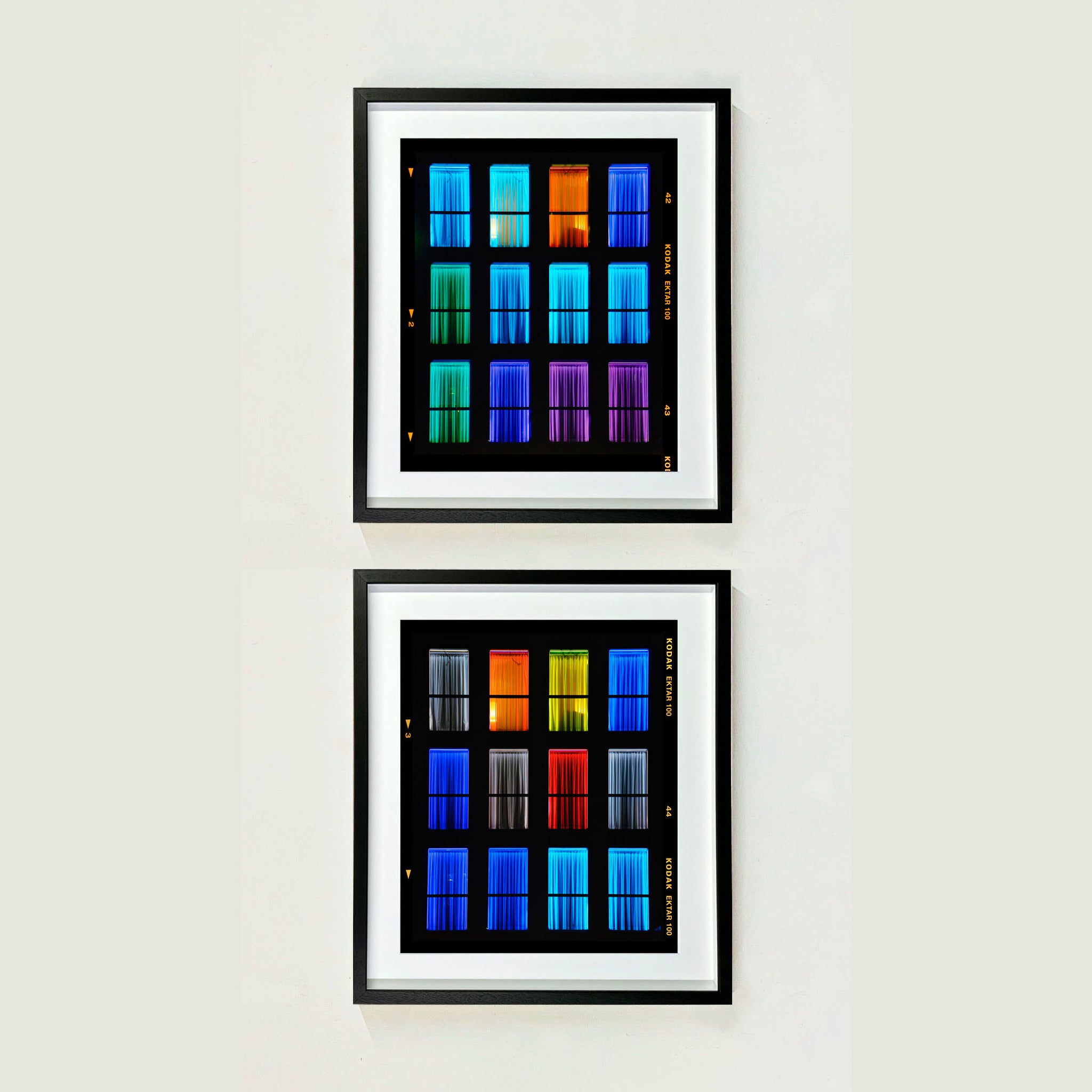 Centric, Italian architecture street photography from Richard Heeps' series, A Short History of Milan. The composition resembles a modern, architectural mosaic, merging minimalism with a raw, emotional spectrum. This artwork stands out for its ability to convey mood and movement through simple yet powerful color contrasts. The uniformity of the window frames juxtaposed with the diverse color palette creates a dynamic visual rhythm, urging viewers to explore each panel individually and as part of the whole.