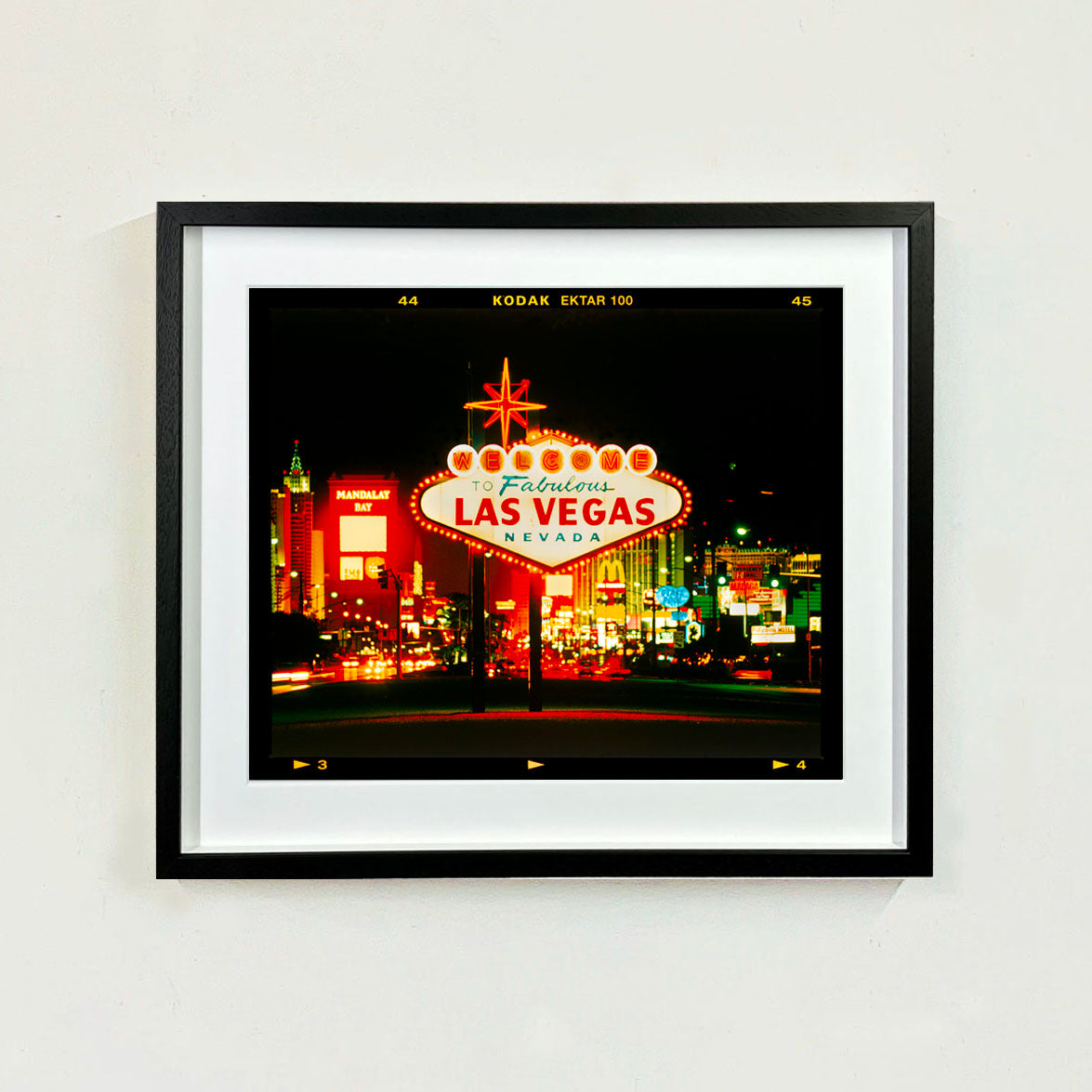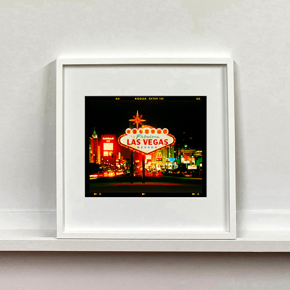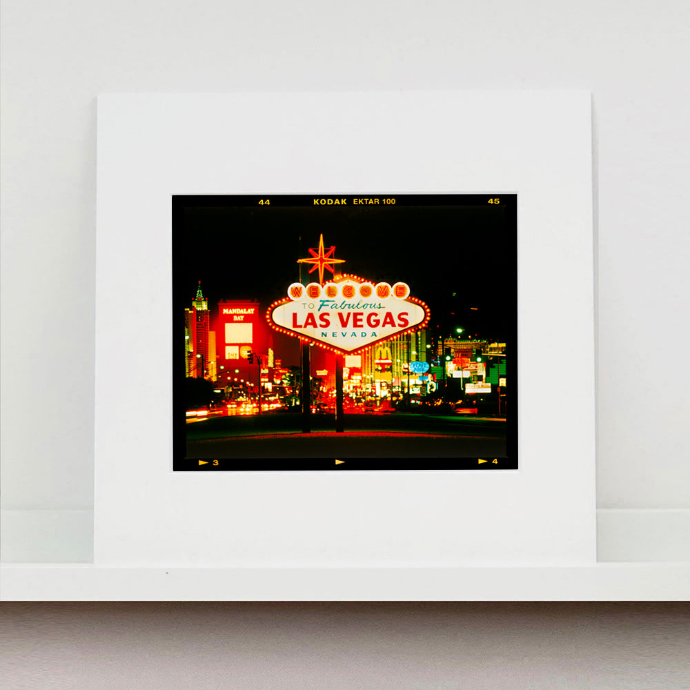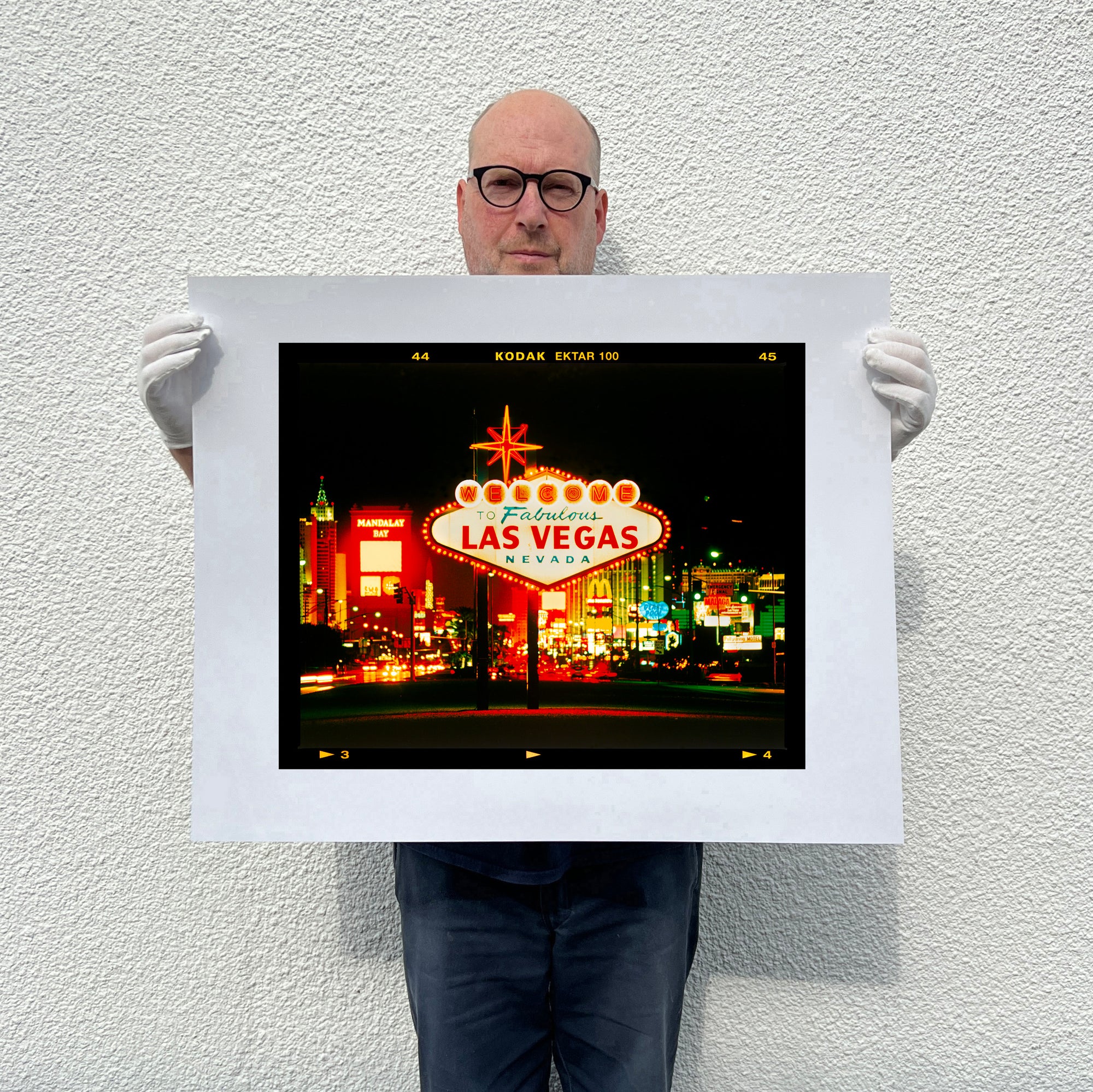 Taken upon arriving in Las Vegas, photograph from Richard Heeps' 'Dream in Colour' series, this artwork captures a classic American neon Googie sign, with the famous Vegas cityscape in the background.