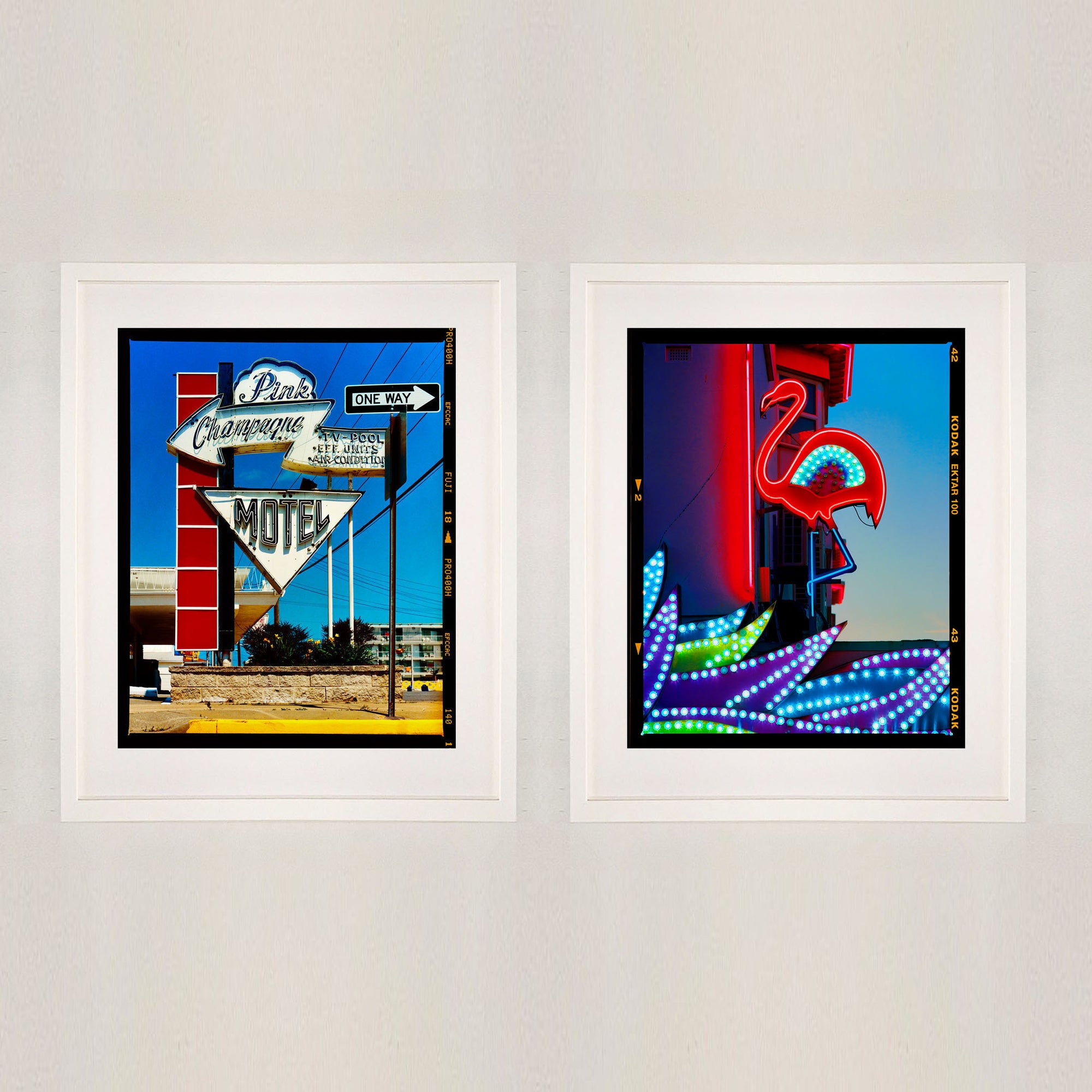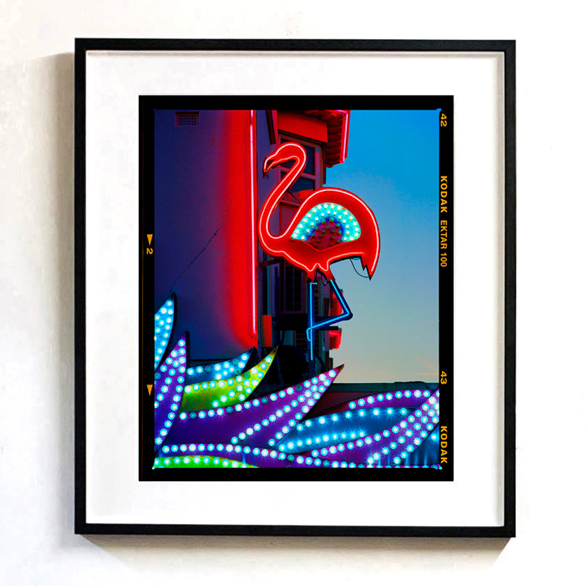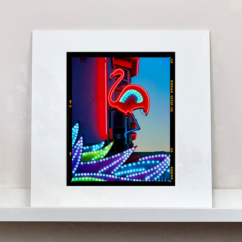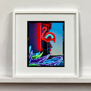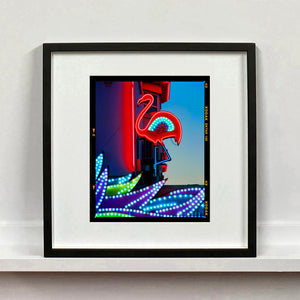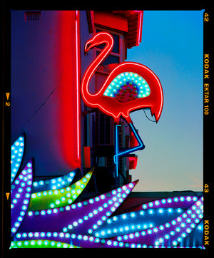 The Kodak film border is a signature element of Heeps' work, which celebrates the aesthetic of traditional film photography. Richard's signature use of hyper-saturated color transforms the ordinary into the extraordinary, with the rich blues of the evening sky and the dazzling, multi-hued lights of the sign below creating a captivating symphony of light and color.